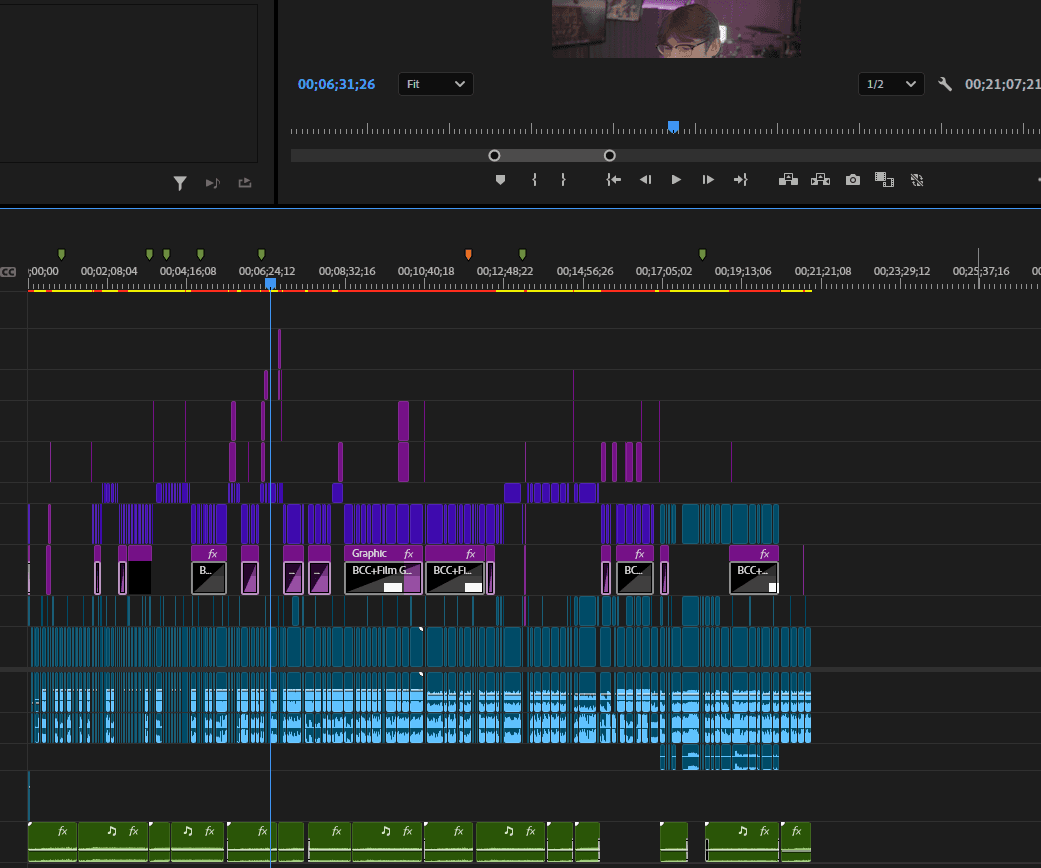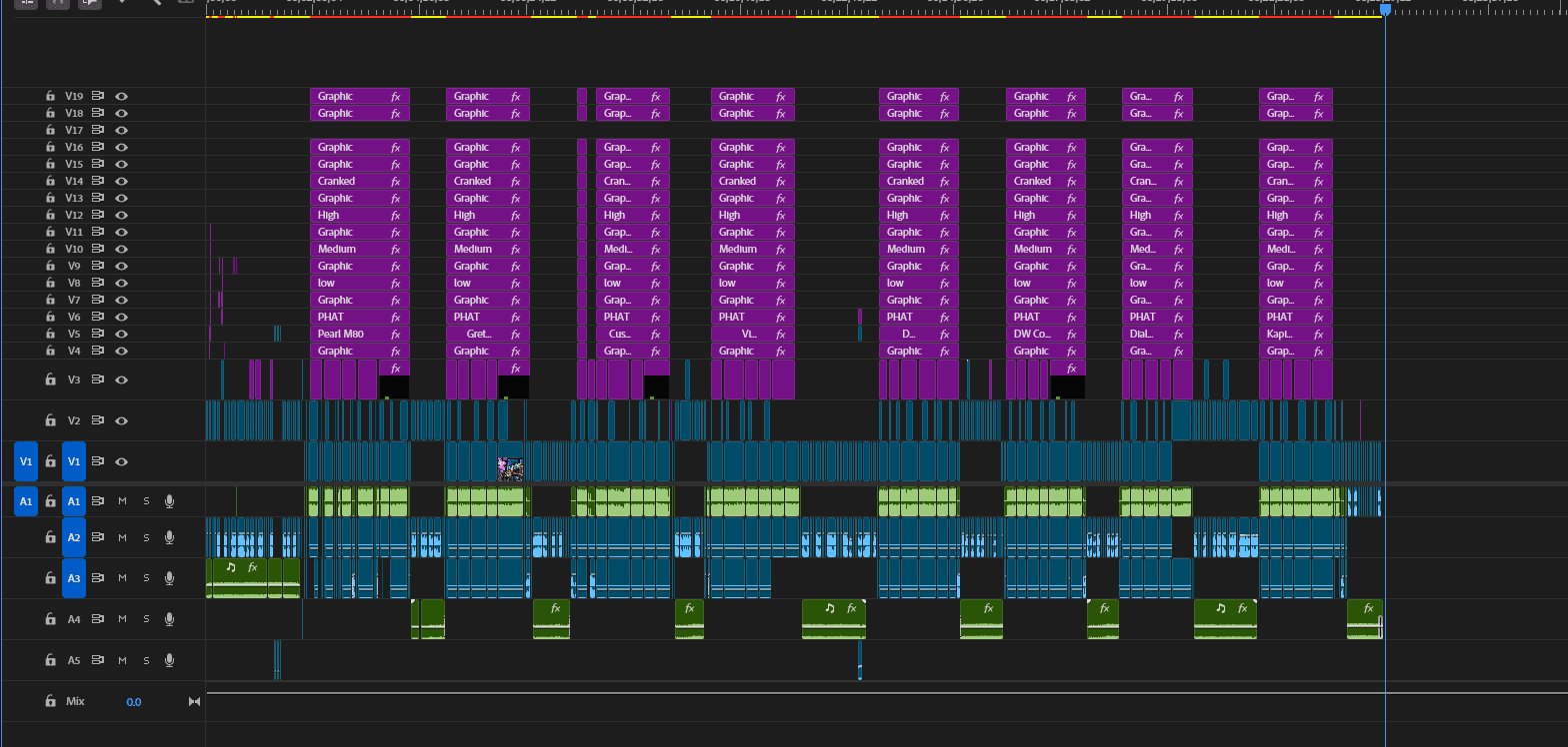 I create these YouTube videos by firstly creating a skeleton of the video, the blue footage. This is simply the master footage with cuts to hide stutters, and just parts of the footage that you don't want in the final export. I then go back and create graphics and text - the purple and pink. I then go back again for my third run through and add funny memes, and things of personal preference that I want to add, just final little touches. Then finally I do the SFX for the video